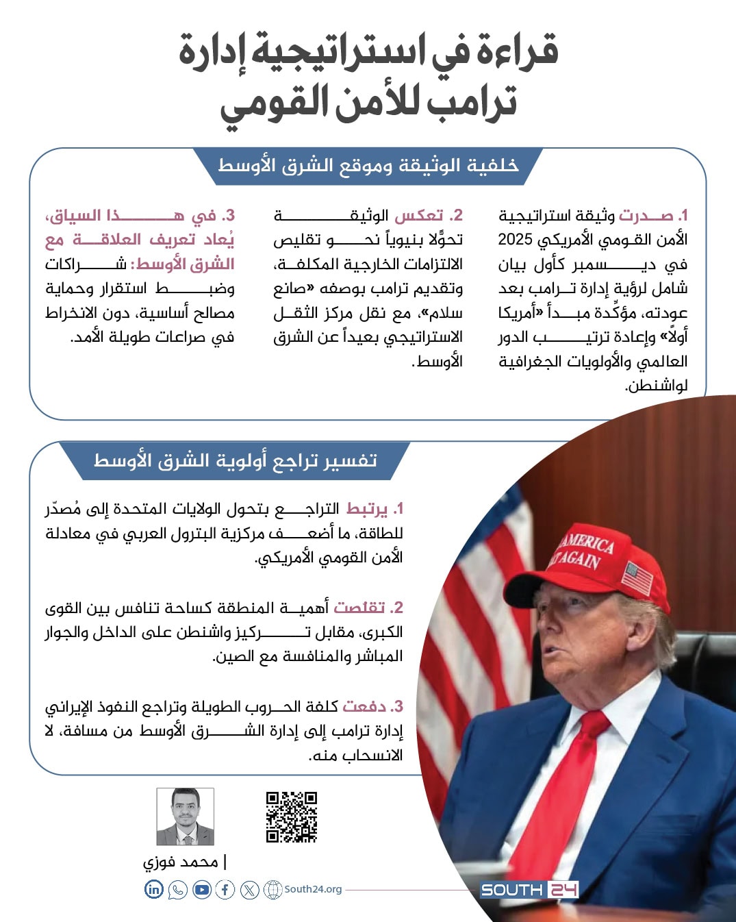 "الوثيقة الأخيرة التي أصدرها البيت الأبيض لا تعيد ترتيب الأولويات الجغرافية فقط، لكنها أيضاً تعلن بوضوح أنّ مركز الثقل الاستراتيجي يتجه بعيداً عن الشرق الأوسط.."مركز سوث24 | محمد فوزي: أصدر البيت الأبيض في 5 ديسمبر الجاري، وثيقة "استراتيجية الأمن القومي الأمريكي" للعام 2025، وهي وثيقة تتكون من 33 صفحة، رسمت معالم ورؤية واشنطن تجاه أولويات الأمن القومي. وقد ارتبطت أهمية هذه الاستراتيجية ببعض الاعتبارات الرئيسية، خصوصاً ما يتعلق برؤية إدارة "ترامب" لأولويات الأمن القومي بعد قرابة عام من عودة الرجل إلى البيت الأبيض، فضلاً عن ما اتسمت به هذه الاستراتيجية من حيث إعلاء مبدأ "أمريكا أولاً"، وصولاً إلى م ...