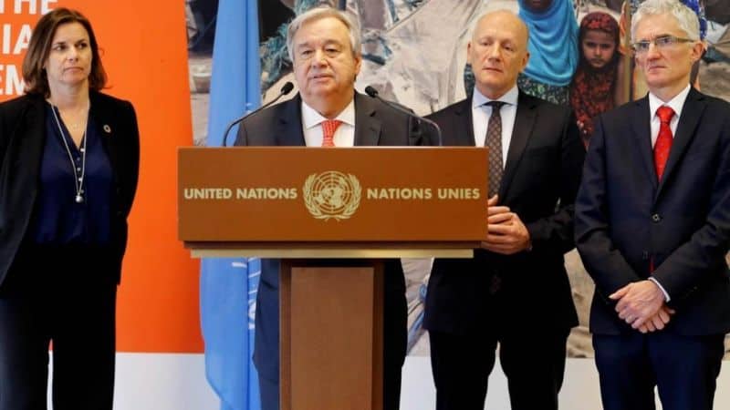 - مصدر الصورة: الأمين العام للأمم المتحدة أنطونيو غوتيريش، إلى جانب كبار المسؤولين السويديين والسويسريين والأمم المتحدة، يلقي كلمة في مؤتمر صحفي بعد الحدث الرفيع المستوى لإعلان التبرعات للأزمة الإنسانية في اليمن، في جنيف، سويسرا، 3 أبريل 2018. (رويترز)