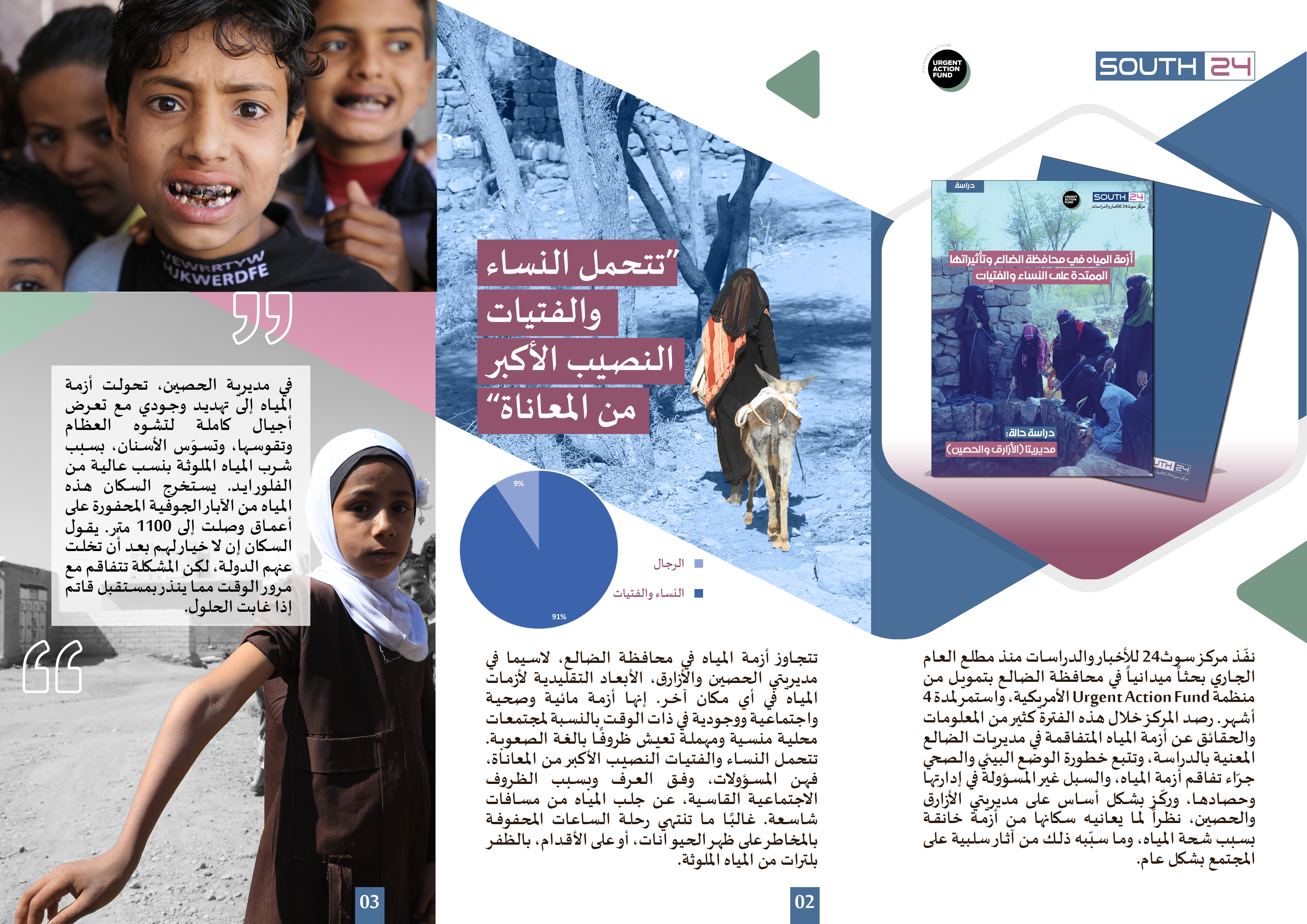 وأضاف: "يدعو مركز سوث24 الحكومة اليمنية المعترف بها دوليا، ومنظمات الأمم المتحدة  وشركائها المحليين في اليمن، إلى التدخل العاجل للتعامل مع أزمة المياه في محافظة الضالع على كل المستويات، وحماية السكان وبالأخص النساء والفتيات من التداعيات الوخيمة لهذه الأزمة".