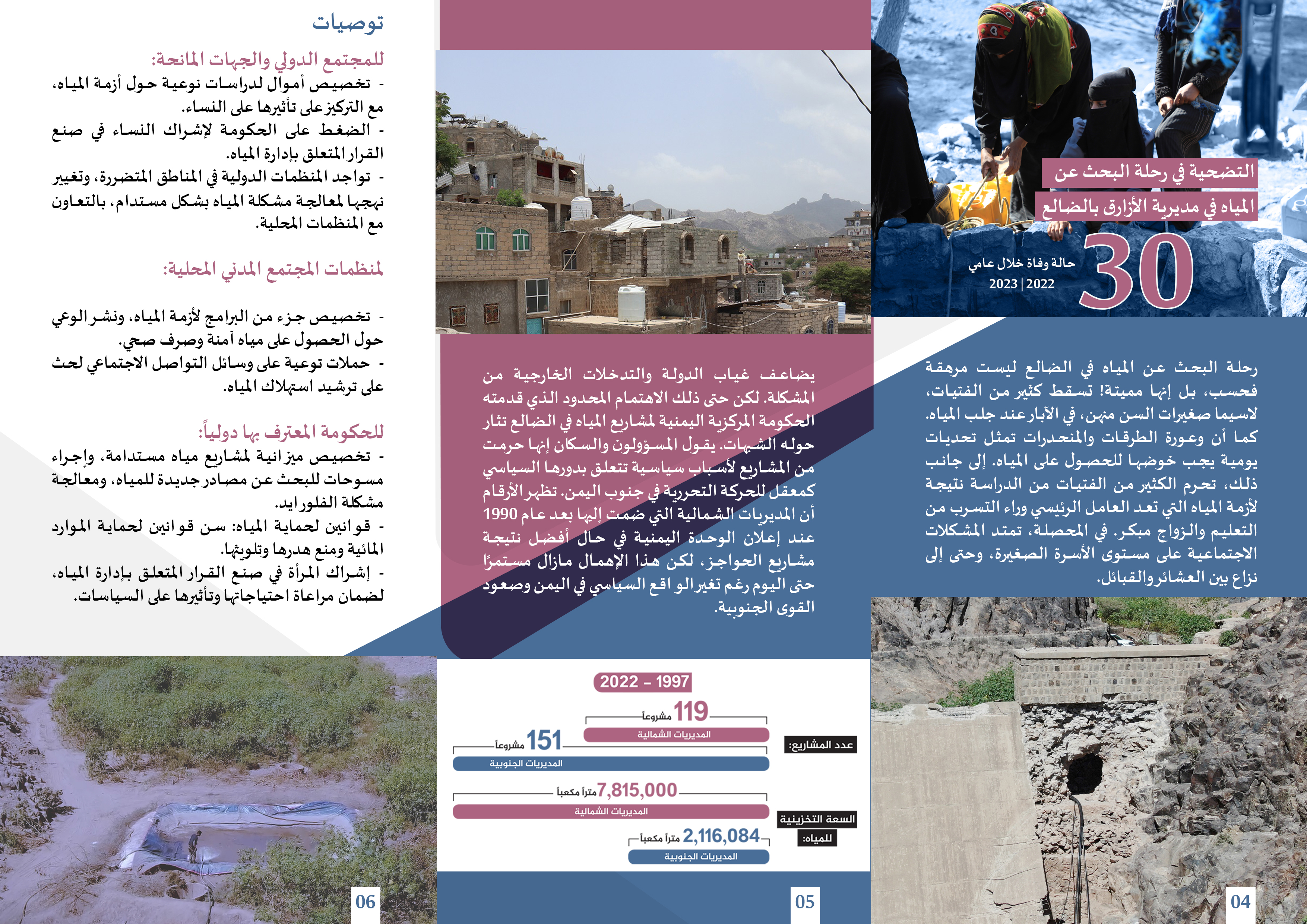 • تخصيص جزء من المشاريع والبرامج لأزمة المياه وتأثيراتها السلبية على السكان في المديريات المتضررة بمحافظة الضالع. ونشر التوعية عن أهمية حصول الجميع على مياه مأمونة وخدمات صرف صحي نظيفة، بدون فوارق جنسية أو عنف قائم على النوع الاجتماعي.