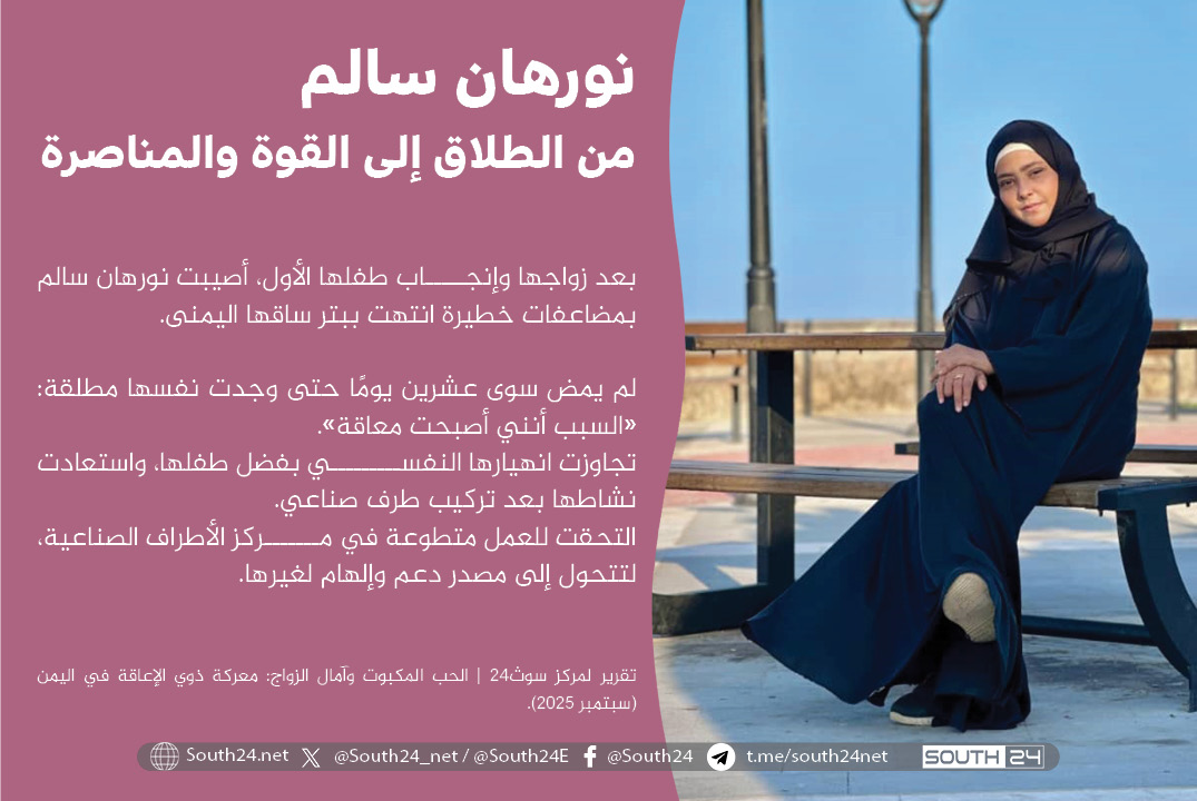 نورهان سالم، شابة من محافظة عدن، عاشت حياة طبيعية أنهت خلالها دراستها الجامعية في كلية القانون – قسم عام. بعد زواجها وإنجاب طفلها الأول، أصيبت بمضاعفات خطيرة أثناء الحمل تمثلت في فيروس مناعي أثر على أوردة ساقها، وانتهى الأمر ببتر ساقها اليمنى تحت الركبة.