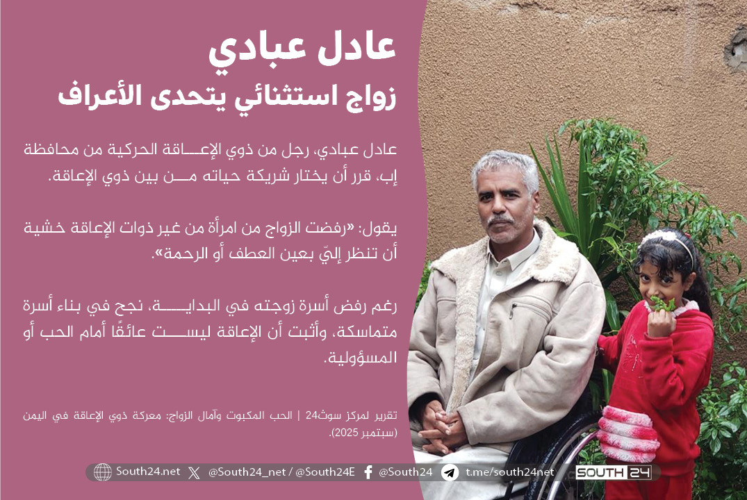 من محافظة إب تبرز تجربة عادل عبادي، الرجل من ذوي الإعاقة الحركية الذي رفع راية الأمل والإصرار في وجه مجتمع لم يتقبل بسهولة قراره بالزواج. عادل قرر أن يختار شريكة حياته من بين ذوي الإعاقة الحركية، مؤمناً أن التفاهم الحقيقي ينبع من الشعور المشترك بالمعاناة والقدرة على التكيف.