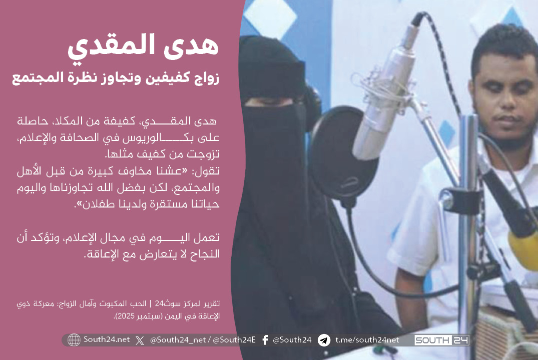 من مدينة المكلا بمحافظة حضرموت، تروي هدى عمر المقدي، الكفيفة وحاصلة على بكالوريوس في الصحافة والإعلام ودبلوم مهني في الإعلام، تجربتها في الزواج من زوج كفيف مثلها.
