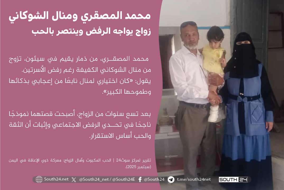 من محافظة ذمار، ويقيم حالياً في مدينة سيئون بمحافظة حضرموت، يروي محمد صالح المصقري لمركز سوث24 تجربته الزوجية مع زوجته الكفيفة منال الشوكاني. تسع سنوات مضت على زواجهما، أثمرت عن طفلتهما تالين البالغة من العمر عامين ونصف، لتصبح قصتهما نموذجاً ناجحاً في تحدي الرفض الاجتماعي.