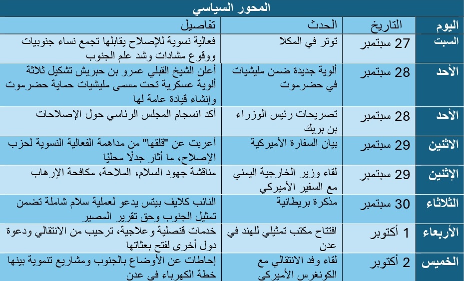 على الصعيد المحلي، أكد رئيس الوزراء سالم بن بريك في مقابلة مع صحيفة الشرق الأوسط يوم الأحد (28 سبتمبر)، أن نجاح الحكومة اليمنية يعتمد على الغطاء السياسي للمجلس الرئاسي وحكمة أعضائه في تجاوز الاختلالات، مشيرًا إلى وجود انسجام داخل المجلس بشأن الإصلاحات مع التركيز على التفاصيل التنفيذية دون المساس بالجوهر. كما شدد على أن الحوثيين "غير جادين بالسلام"، وأن الشعب "لن يقبل بإعادة عجلة التاريخ إلى الوراء".