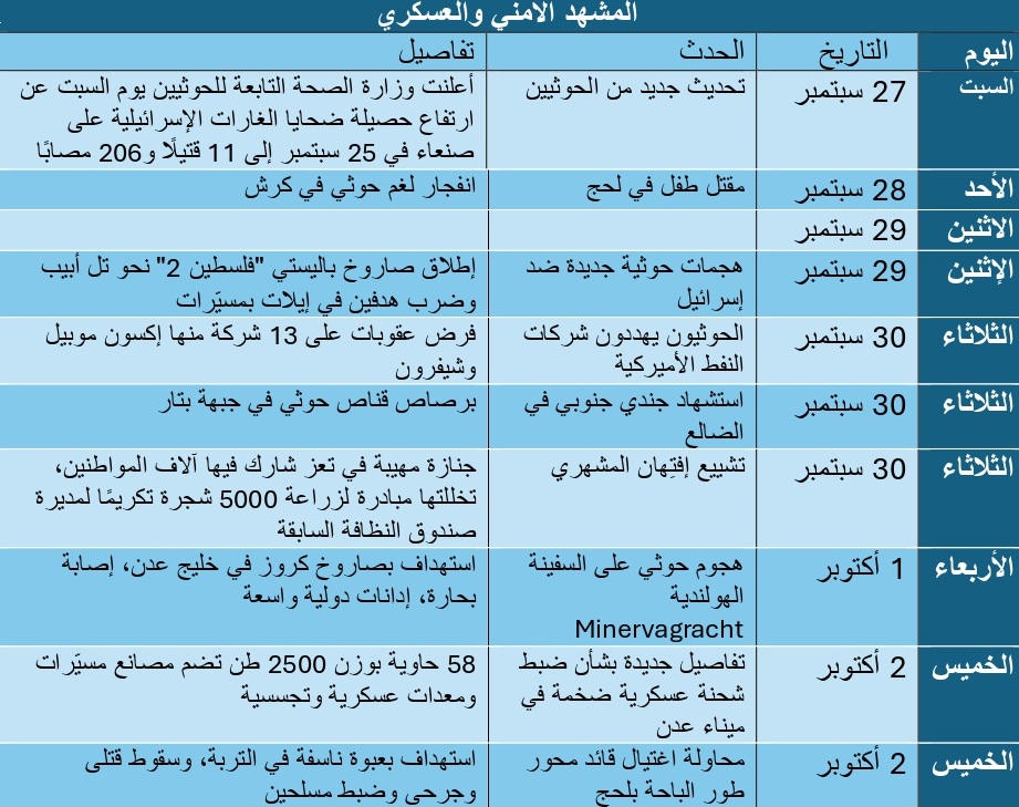 على المستوى الإقليمي، شهد الأسبوع استمرار التصعيد العسكري بين الحوثيين وإسرائيل، حيث أعلنت وزارة الصحة التابعة للحوثيين يوم السبت عن ارتفاع حصيلة ضحايا الغارات الإسرائيلية على صنعاء في 25 سبتمبر إلى 11 قتيلًا و206 مصابًا. ووصف زعيم الجماعة عبد الملك الحوثي استهداف إسرائيل لمقر يتبع جهاز الأمن والمخابرات بأنه "جريمة وخطوة فاشلة".