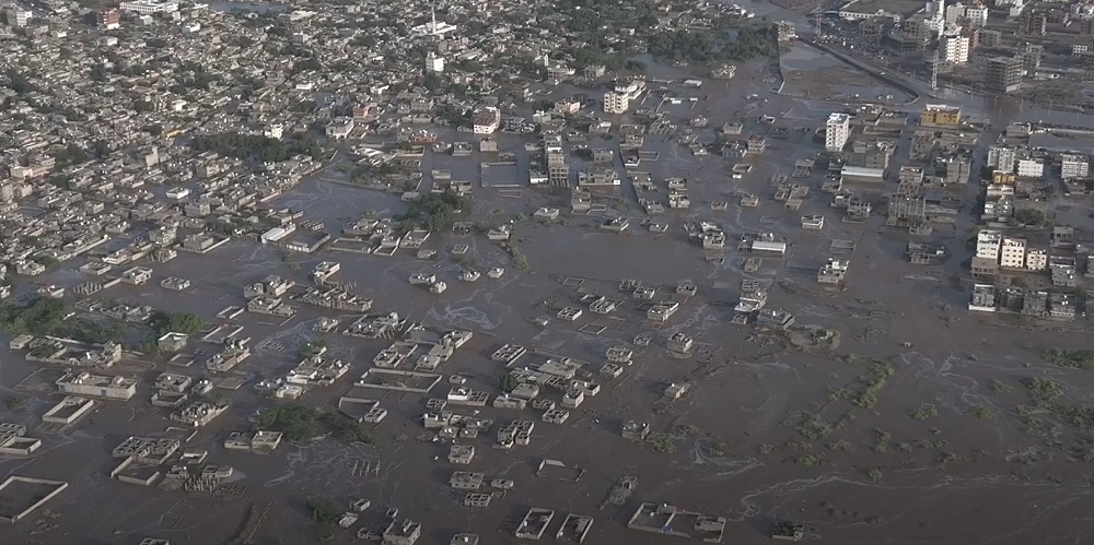 لقطة جوية مقتطعة من فيديو لقناة عدن المستقلة لكارثة سيول الحسوة بعدن، 23 أغسطس 2025 (استقطاع بواسطة مركز سوث24)