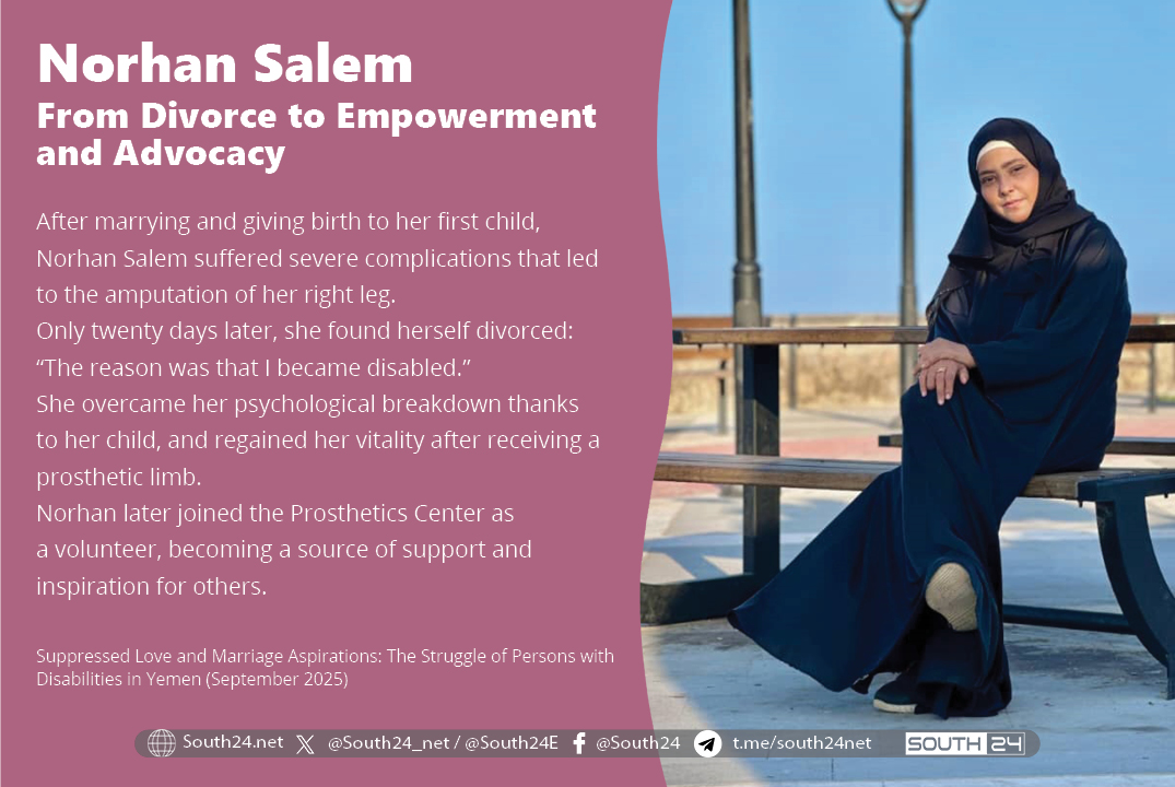 Norhan Salem, a young woman from Aden Governorate, lived a normal life during which she completed her university studies at the Faculty of Law – Public Law Department. After getting married, while pregnant with her first child, she suffered severe complications due to an autoimmune disease that affected the veins in her leg, ultimately leading to the amputation of her right leg below the knee.