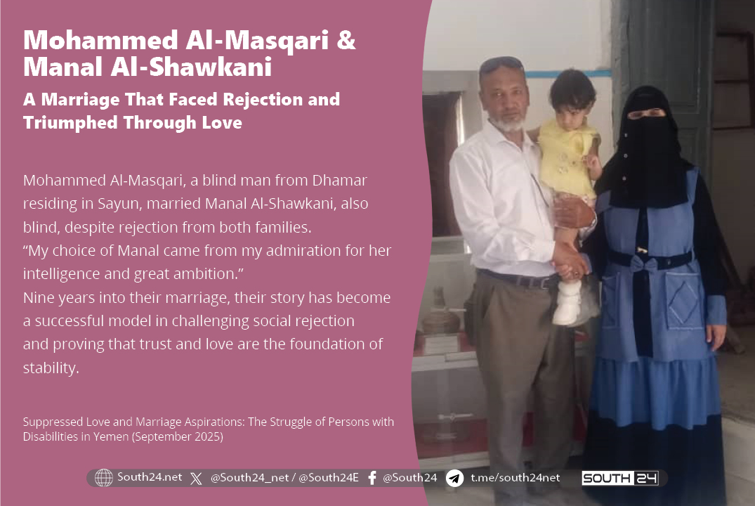 From Dhamar Governorate, currently residing in the city of Seiyun in Hadramout, Mohammed Saleh Al-Masqari shares with South24 his marital experience with his blind wife, Manal Al-Shawkani. Nine years into their marriage, they have a daughter Taleen, now two and a half years old—making their story a successful model in challenging societal rejection.