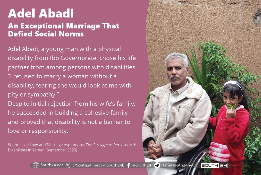From Ibb Governorate emerges the story of Adel Abadi, a man with a physical disability who raised the banner of hope and determination in the face of a society that did not easily accept his decision to marry. Adel chose his life partner from among women with physical disabilities, believing that true understanding stems from shared suffering and the ability to adapt.