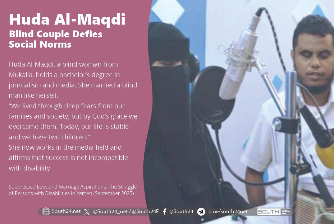 From the city of Mukalla in Hadramout Governorate, Huda Omar Al-Maqadi—a blind woman holding a Bachelor's degree in Journalism and Media and a professional diploma in Media—shares her experience of marrying a husband who is also blind.